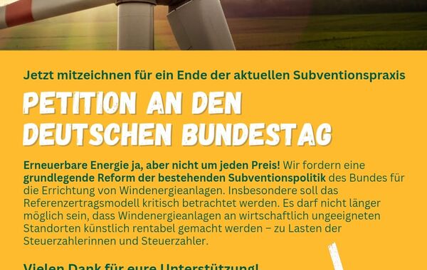 Die Bürgerinitiative „Nein! zum Monsterwindpark“ fordert eine Reform der Windkraft-Subventionen. Unterstütze unsere Petition an den Deutschen Bundestag.